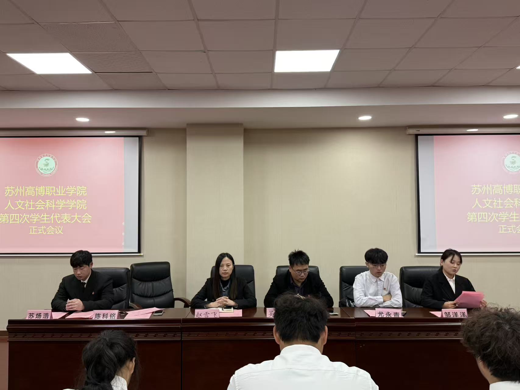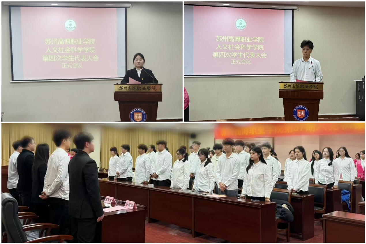 苏州高博职业学院人文社会科学学院第四次学生代表大会近日隆重举行。学院党总支副书记、副院长赵雪飞,分团委书记吴敬德出席会议,44名学生代表齐聚一堂,以青春担当为学院学生工作高质量发展注入新动能。