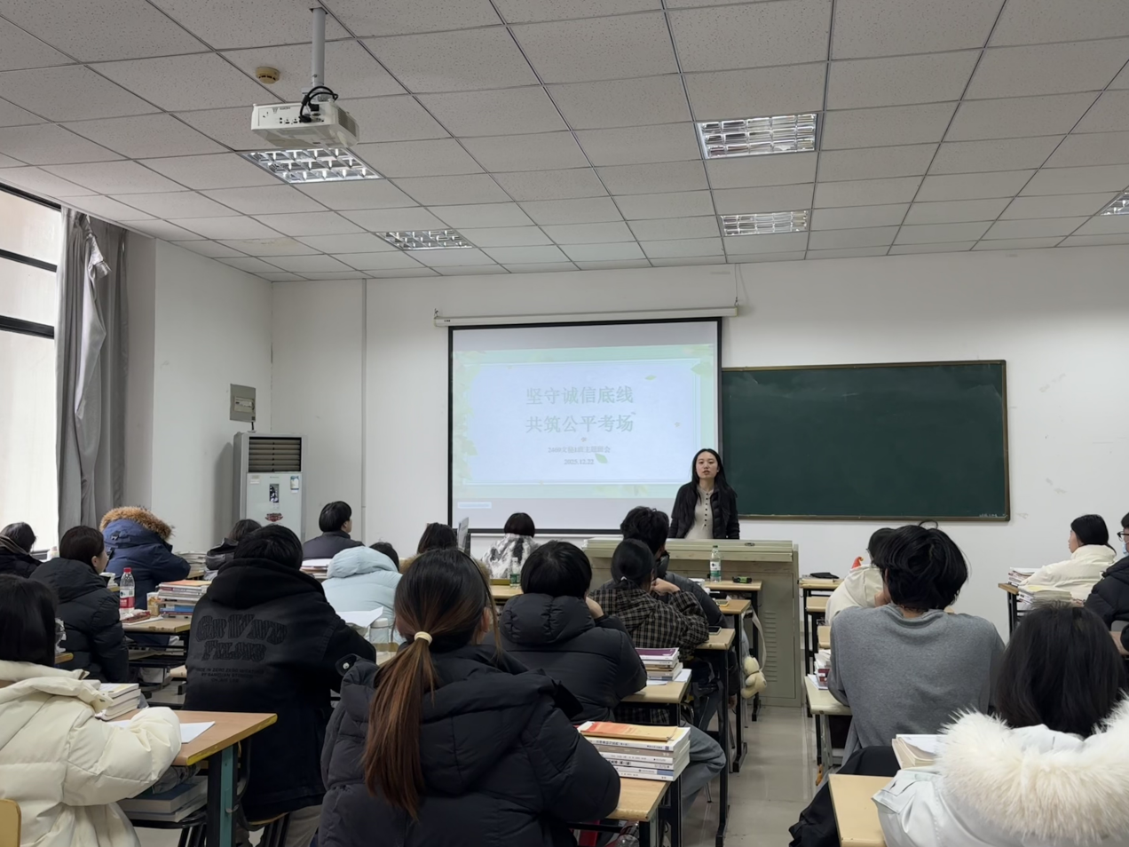 为帮助学生系统复盘本学期学业内容,明确期末复习方向,强化诚信考试意识,12月22日,人文社会科学学院2469现代文秘班在14号楼324室召开了“坚守诚信底线,共筑公平考场”期末主题班会。本次主题班会由兼职班主任陶薇老师主持,2469现代文秘班全体学生参加。