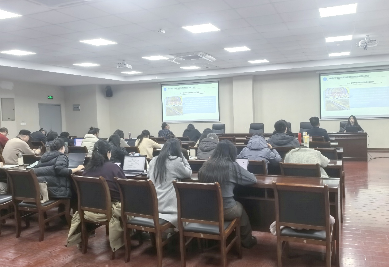 会上,孙依晨老师以铸牢中华民族共同体意识为核心,从战略意义、丰富内涵、实践深化三个方面作专题辅导报告。报告中,孙老师结合中东地区民族宗教冲突的现实案例,与我国56个民族和睦共融的发展现状形成鲜明对比,深刻阐释了中华民族共同体意识是我国各民族长治久安、繁荣发展的核心密码。同时系统讲解了铸牢中华民族共同体意识的“四个与共”共同体理念、“五个认同”核心要求和“五个共同”重要内涵,全面阐述了坚持党的全面领导、推动各民族共同富裕、构筑共有精神家园等实践路径,并深入分析了铸牢中华民族共同体意识在应对风险挑战、推进强国建设、改进民族工作中的重大战略意义。