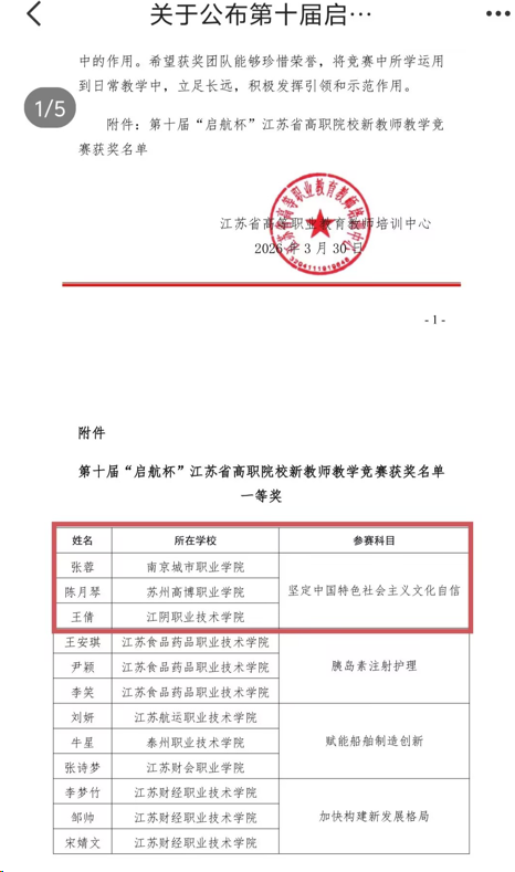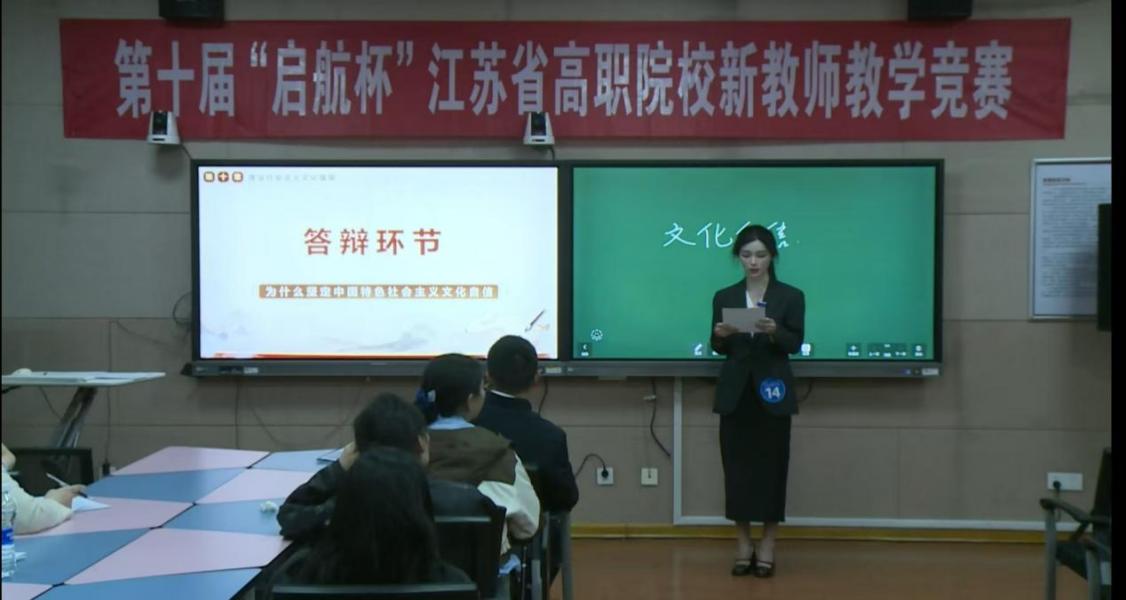 3月29日,由江苏省高等职业教育教师培训中心主办、江苏理工学院承办的第十届“启航杯”江苏省高职院校新教师教学竞赛决赛圆满收官。我校马克思主义学院青年教师陈月琴凭借参赛作品《坚定中国特色社会主义文化自信》,在全省思政课教师新秀角逐中脱颖而出,荣获一等奖第一名的好成绩,以过硬实力展现了我校思政课青年教师的卓越风采。