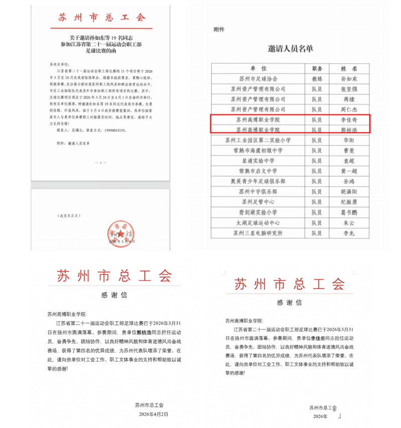 我校教师代表苏州队出征省运会,不仅为苏州代表队争得了荣誉,也充分展现了我校教职工昂扬向上、奋发有为的良好形象。未来,我校将继续推动教职工体育事业发展,鼓励更多教职工参与体育锻炼,提升身体素质,凝聚奋进力量。