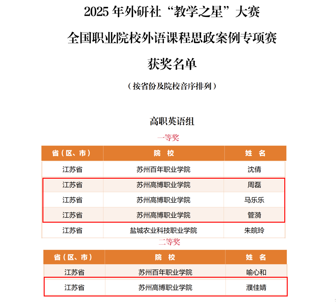 近日,2025年外研社“教学之星”大赛全国职业院校外语课程思政案例专项赛获奖名单正式公布。我校人文学院外语系四位参赛教师凭借出色的课程设计与思政融合能力,在比赛中取得优异成绩。其中,周磊、马乐乐、管漪等三位老师荣获全国一等奖,濮佳婧老师荣获全国二等奖,充分展现了我校外语课程思政建设的扎实基础和先进水平。