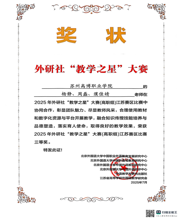 2025年外研社“教学之星” 大赛(高职组)江苏省赛区的比赛结果揭晓,由我校人文社会科学学院公共英语教研室杨静、周磊和濮佳婧三位老师组成的参赛团队表现出色,荣获三等奖。这一成绩不仅为我校争得了荣誉,也展现了我校教师在教学创新与实践方面的深厚实力。