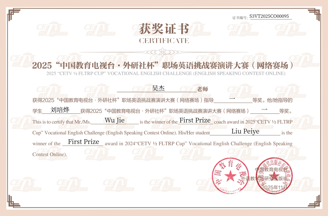 近日,2025“中国教育电视台•外研社杯”职场英语挑战赛演讲大赛(网络赛场)决赛落下帷幕,我校国商学院2374会计班胡娜娜、2458会计班陈淑君、机电学院2439智能制造班刘培烨等三名学生在比赛中表现出色,分别荣获一等奖。